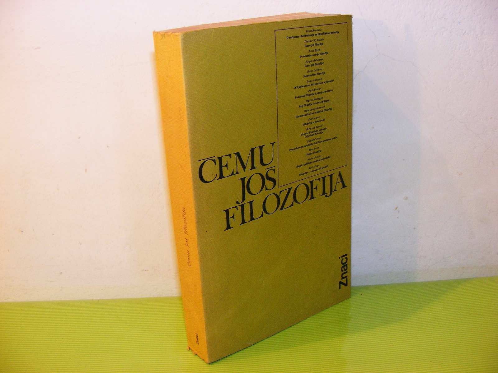 CEMU JOS FILOZOFIJA Brentano, Adorno, Bloch, Habermas, Lefebvre, Althysser, Ricoeur, Heidegger, Gadamer, Jaspers, Russell, Carnap, Bense, Schulz, Ulmer. .. Izbor i pogovor: Josip Brkic Znaci, Zagreb, 1982 356 strana Stanje: vrlo dobro