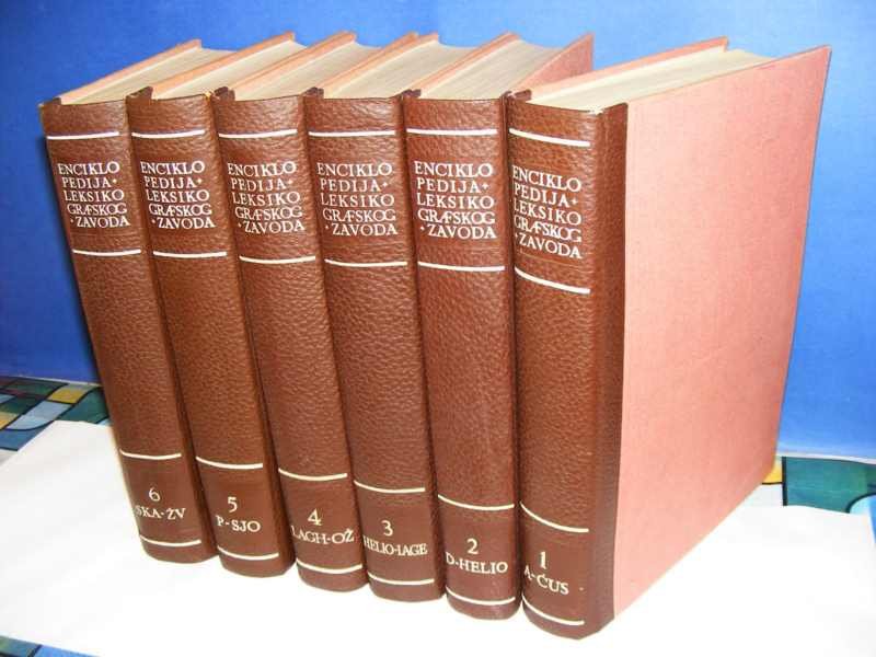 Enciklopedija leksikografskog zavoda 1-6 komplet Štampana je od 1966 prvi tom a zadnji šesti 1969god. štampa `Jugoslovensi leksikografski zavod` Zagreb, direktor Miroslav Krleža. Tematika enciklopedije je sveobuhvatna od istorije, geografije, umetnosti, medicine, vojne, hemije, fizike, biljaka, .. . Svaka knjiga ima između 700-800 strana, tvrd povez jako kvalitetna štampa sa mnogo ilustracija iz svih oblasti. Dimenzije knjiga su 22x30x5-5,5cm. Stanje: Vrlo dobro.